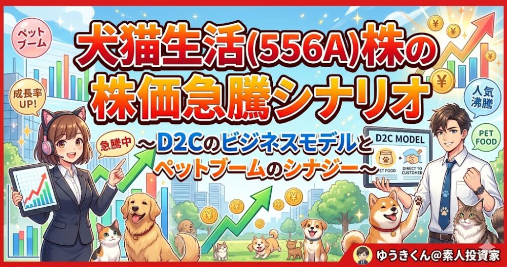 今日の株式市場において、個人投資家の注目を一身に集めている銘柄の一つが犬猫生活(556A)です。ペットブームという巨大な市場のうねりと、収益性の高いD2Cモデルが融合したとき、どのような化学反応が起きるのか。今回は、同社のビジネスモデルを深掘りし、なぜ今、株価急騰の可能性が囁かれているのかを徹底解説します。